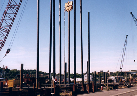 New London, CTThe scope of this marine construction project included the demolition and replacement of the west side of the State Pier, an 1100' by 70' commercial pier in New London Harbor. The work included riprap and rock walls, placing large broken stone on earth surfaces for protection against the action of water, erosion protection, harbor structures, roadway systems, underwater construction, underwater utilities, pile driving and extraction, repair and demolition of piers, bulkheads, reinforced concrete, precast concrete, fender systems, mechanical work, electrical work, brick paving, waterproofing, cathodic protection work, and sitework. The new cast-in-place concrete deck is supported by a network of 337 steel piles, each pile is 18 inches in diameter and 140 feet long. The piles were driven through 8 to 15 feet of riprap and had a 3-inch tolerance for alignment at the cut-off elevation.