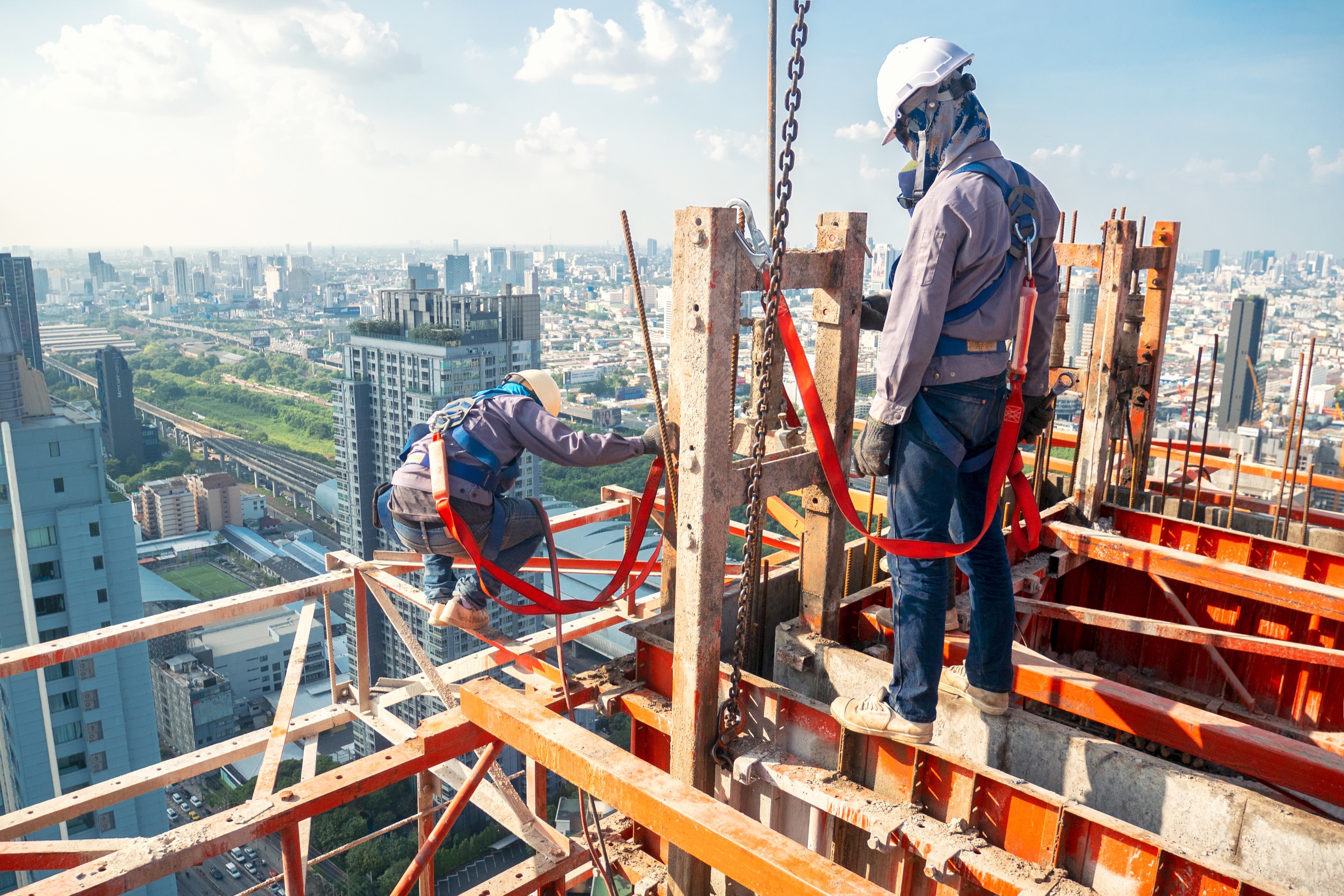 Construction worker wear standard personal protective equipment dismantle steel structure at height rise building project